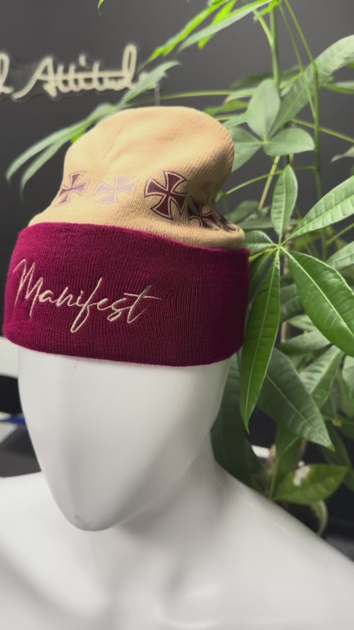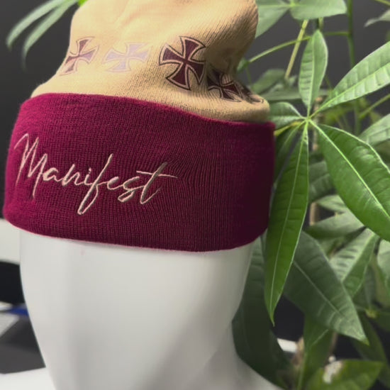 The MANIFEST™ Cross Beanie combines bold style with powerful symbolism. The deep crimson cuff features premium embroidered “Manifest” lettering — a daily reminder to stay locked in on your goals. The gold upper is detailed with gothic cross accents, giving the piece a unique, high-end streetwear edge.